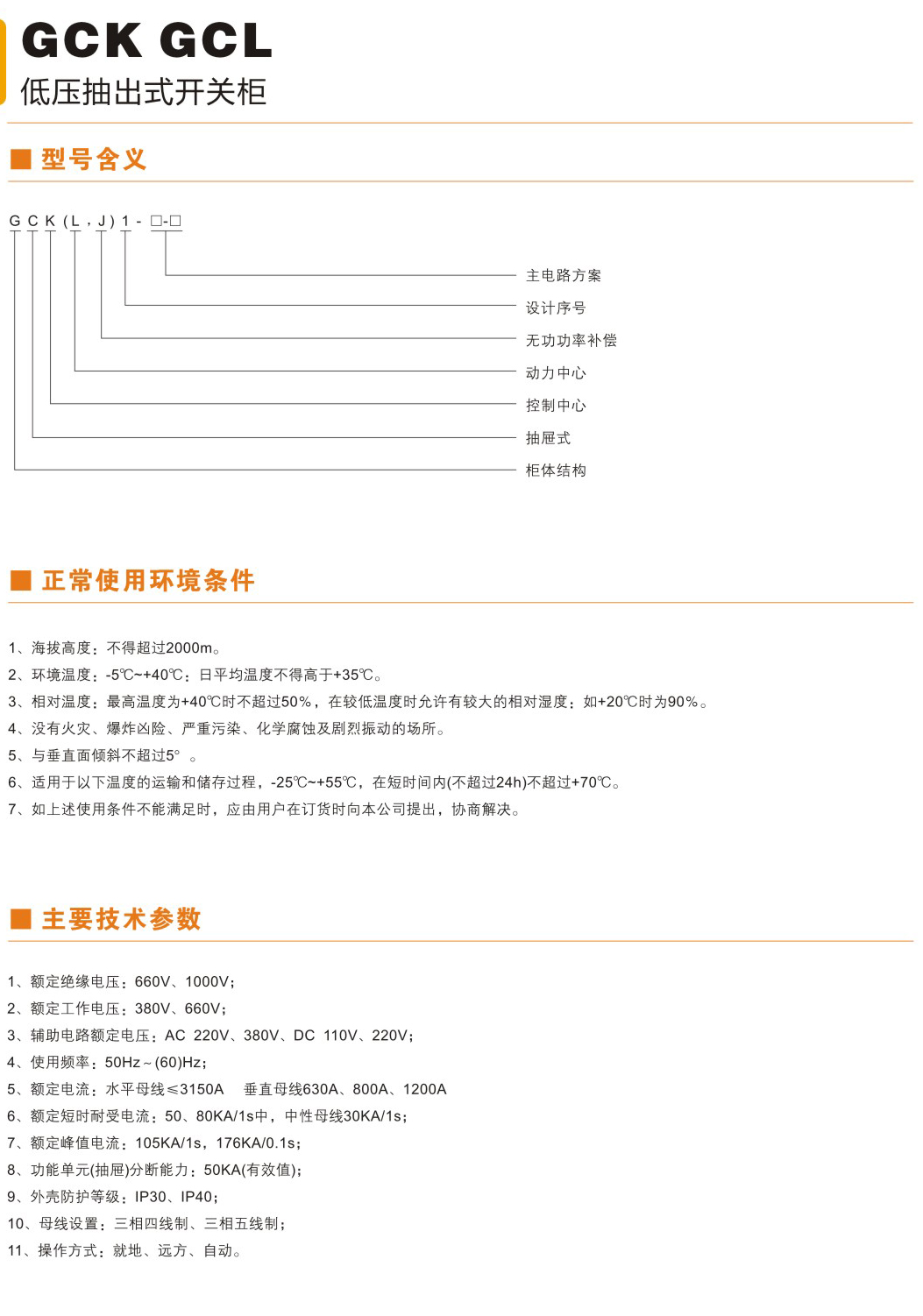 GCK低压抽出式开关柜(以下简称开关柜)是我公司消化吸收国际同类先进技术而开发的新产品。本产品适用于额定工作电压 380V,交流三相四线、三相五线系统,作为电力系统的发电厂、变电站、工矿企业和高层建筑中受电、馈电、无功功率补偿、电能 计量、照明及电动机集中控制之用。 本产品符合标准:GB7251.1《低压成套开关设备和控制设备》、JB/T9661《低压抽出式开关设备》、IEC60439-1《低压成套开 关设备和控制设备》。