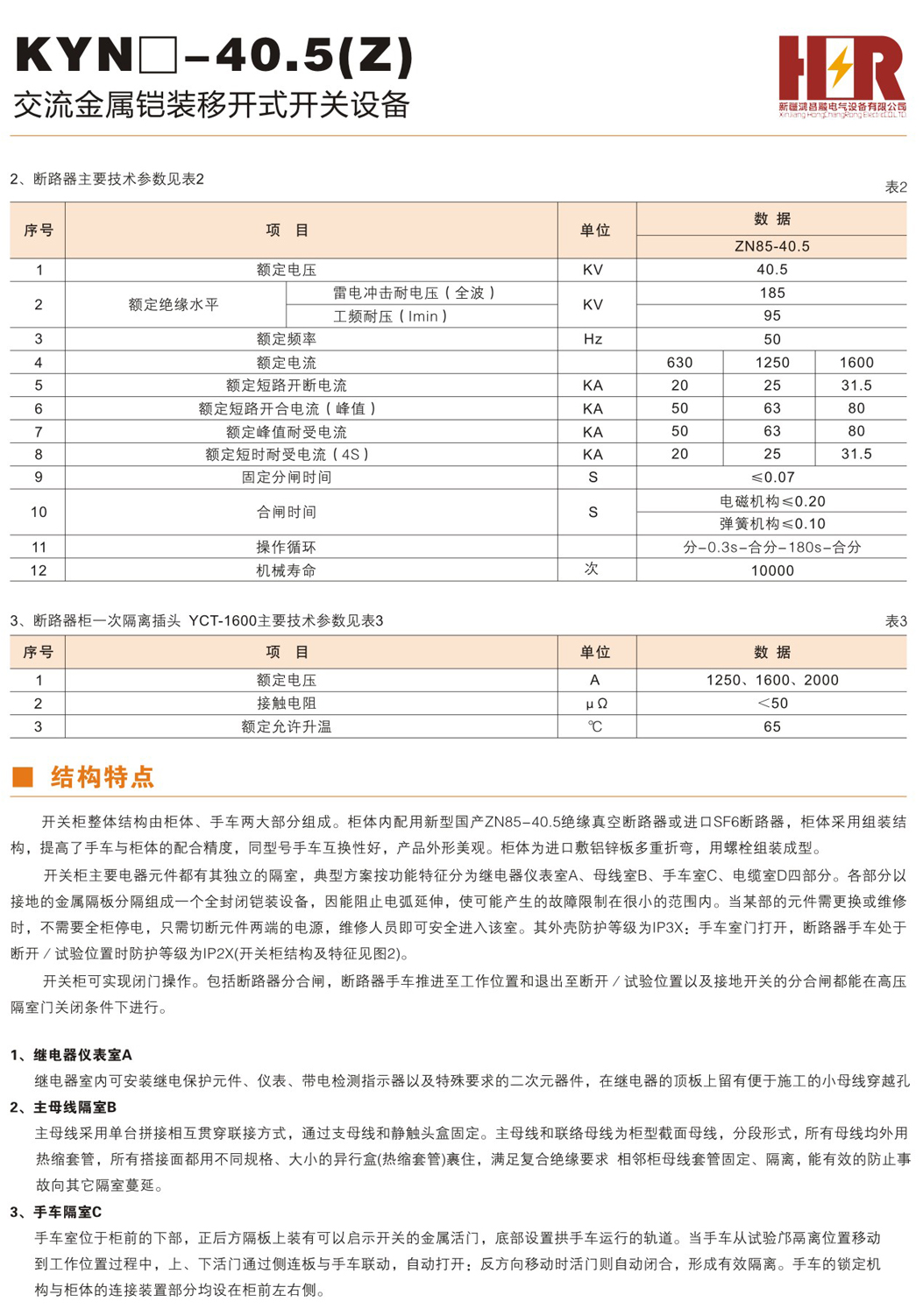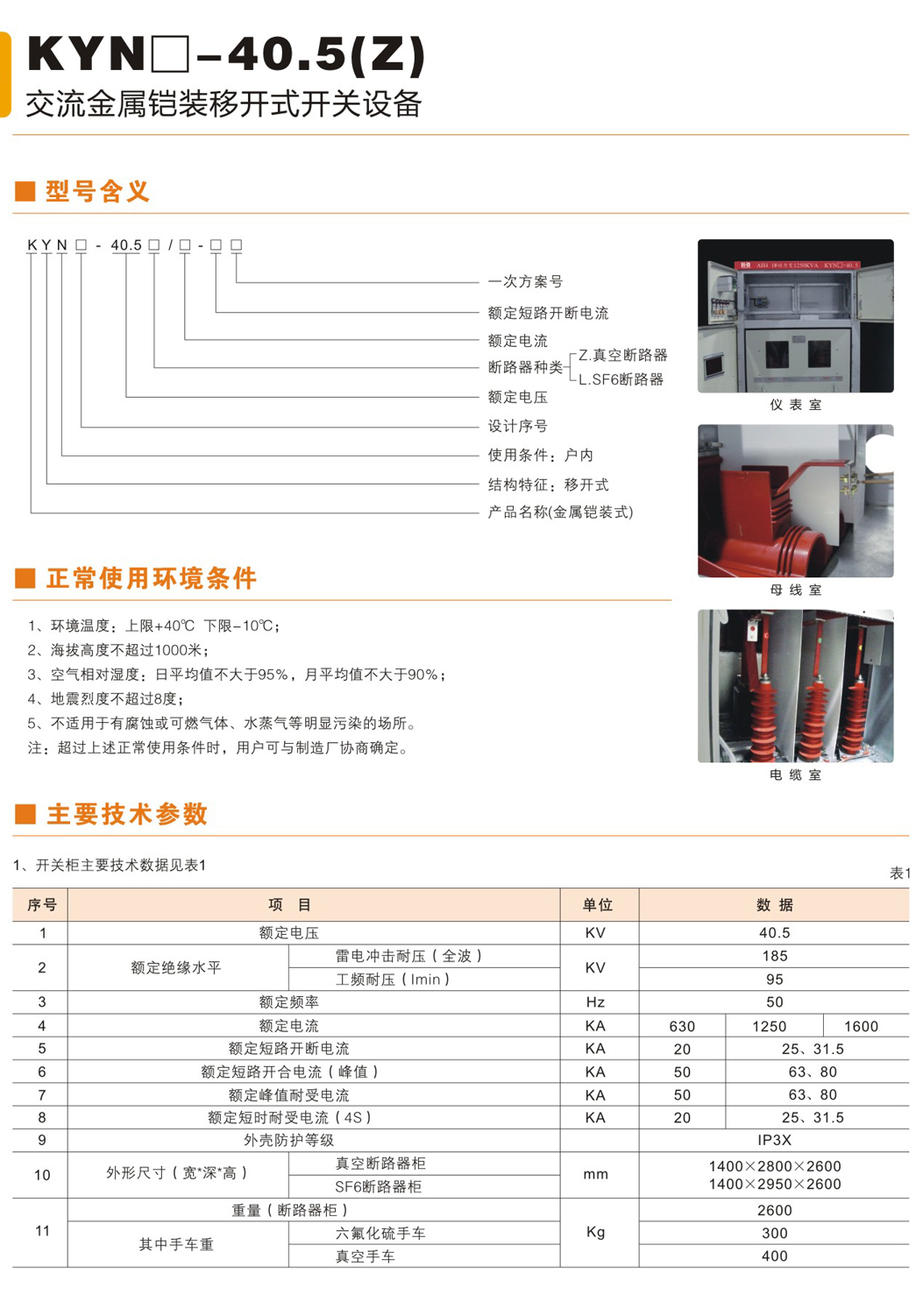 KYND-40.5(Z)交流金属铠装移开式开关设备(以下简称开关柜)系三相交流50Hz、额定电压40.5kV户内成套配电装置,主要用于 发电厂、变电站及工矿企业的配电室接受与分配电能,可实现对电路的控制、保护和检测之用;还可用于频繁操作的场所。本开关柜 符合GB3906-2006《3.6-40.5kV交流金属封闭开关设备和控制设备》、GB/T11022《高压开关设备和控制设备标准的共用技术要 求》、IEC62271:200《额定电压1kV以上52kV以下交流金属封闭开关设备和控制设备》、DL/T404《户内交流高压开关柜订货技术条 件》等标准。