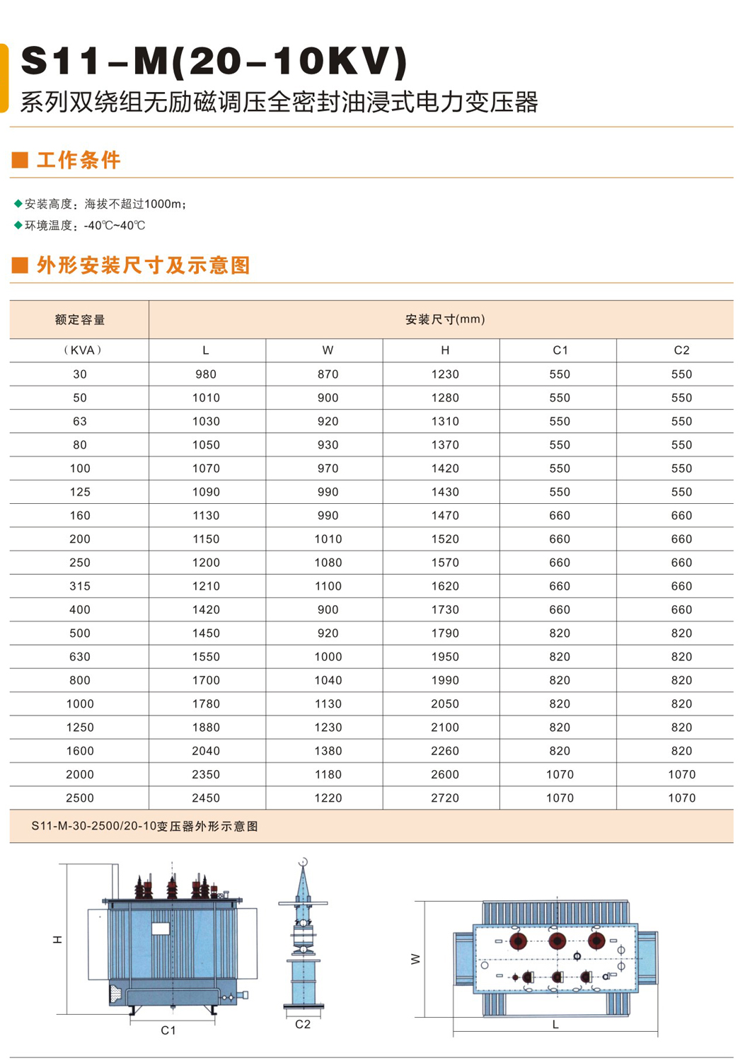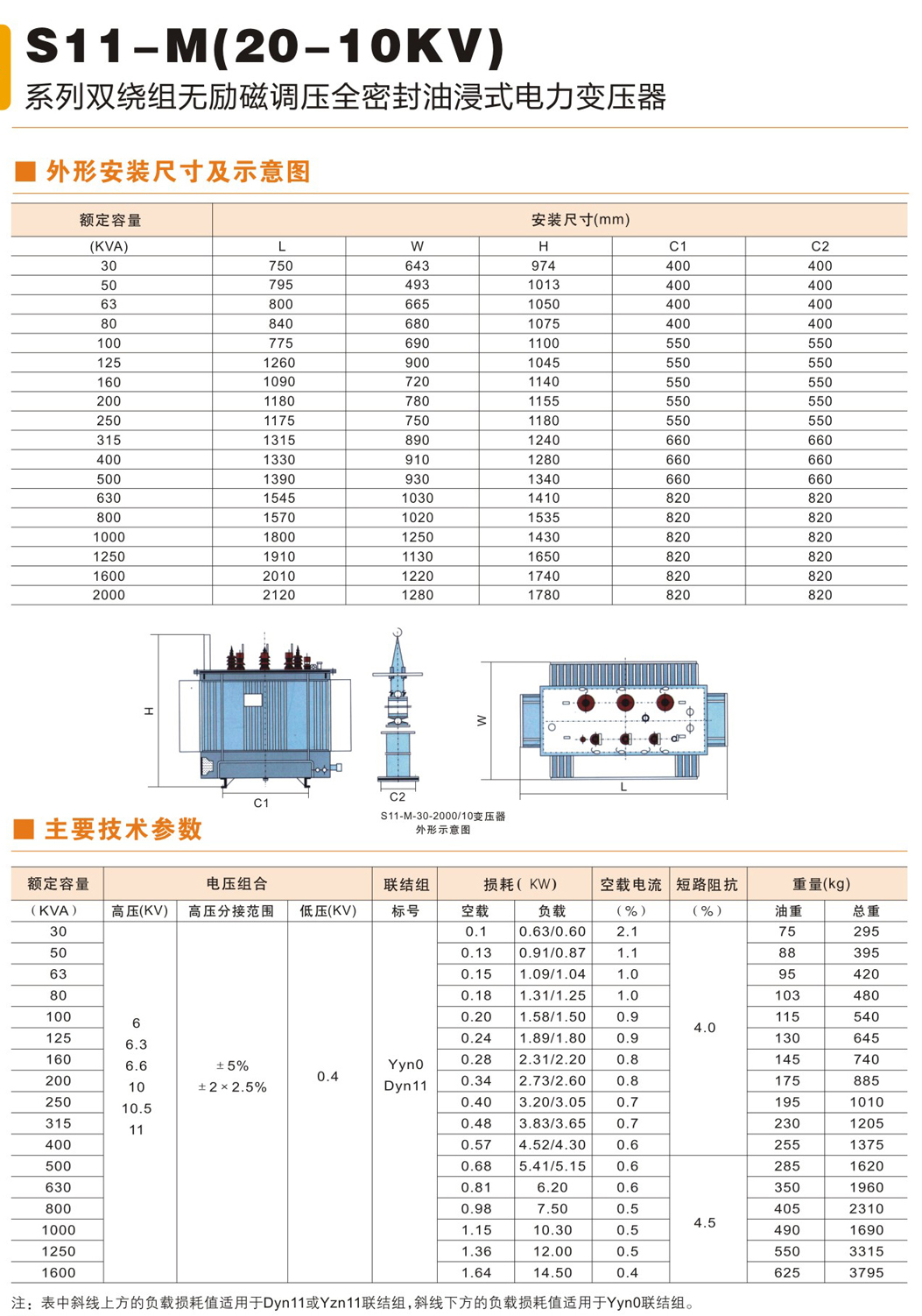 S11-M20-10KV系列双绕组无励磁调压全密封油浸式电力变压器是我公司生产的三相油浸式配电变压器,器身采用了新型绝缘结 构,提高了抗短路能力;铁心由高质量冷轧硅钢片制成;高压绕组均选用优质无氧铜线为材料,并采用多层圆筒式结构;所有紧固 件均采用特殊防松处理。 产品具有高效,低损耗的特点,可节省大量的电耗和运行费用,社会效益显著,是国家推广的高新技术产品。