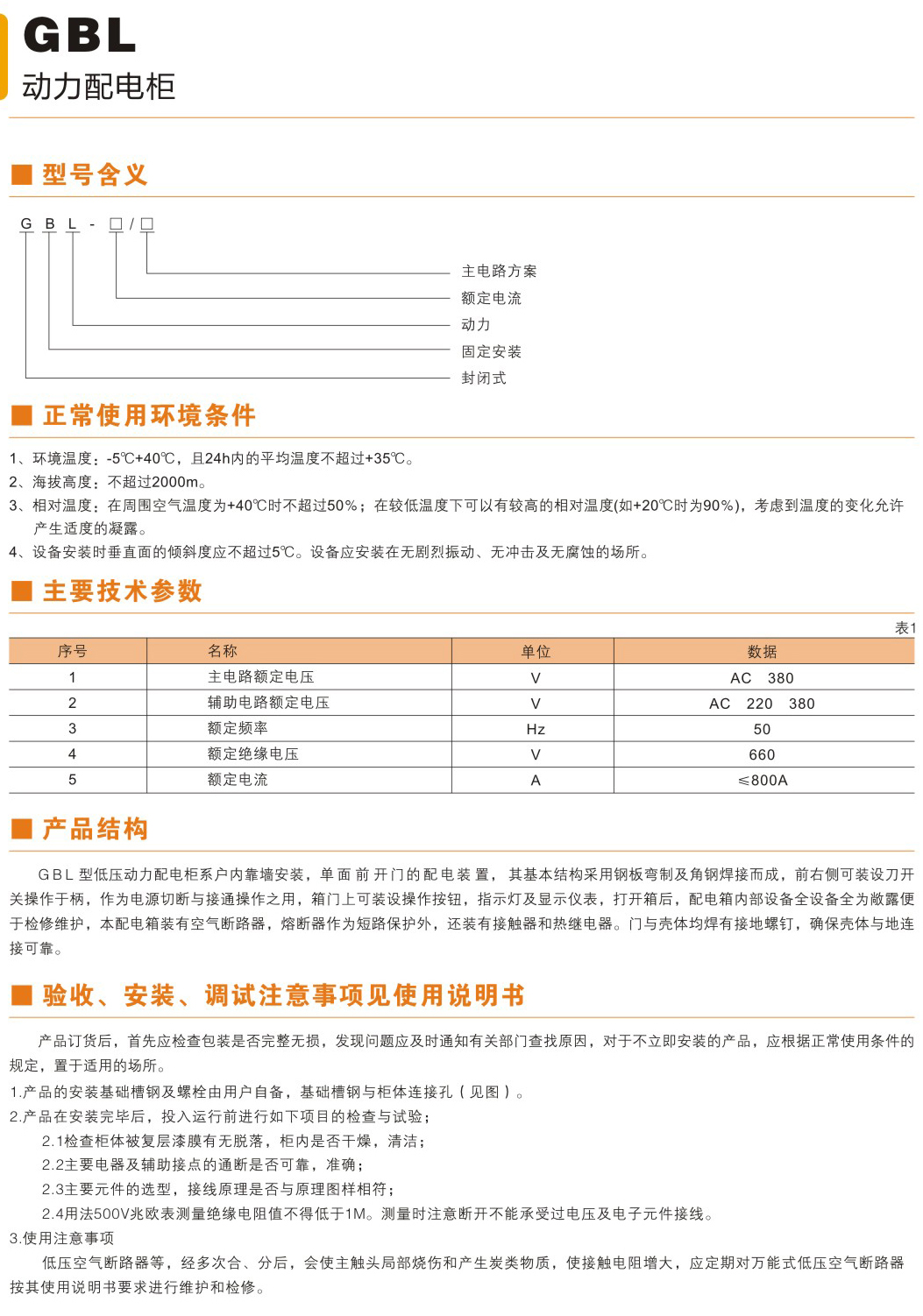 GBL系列动力配电柜适用于发电厂及工矿企业、交流电压550V及以下的三相三线、三相四线、三相五线制系统,作动力照明配电 之用QGBL动力配电柜系户内装置,靠墙安装,屏前检修"