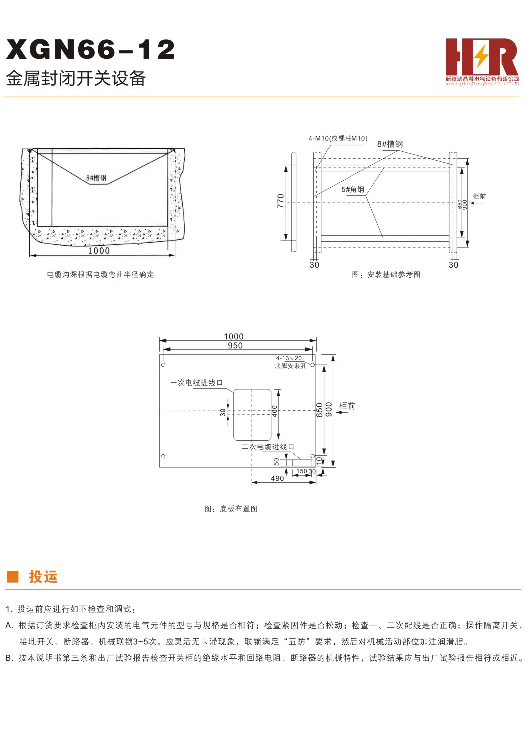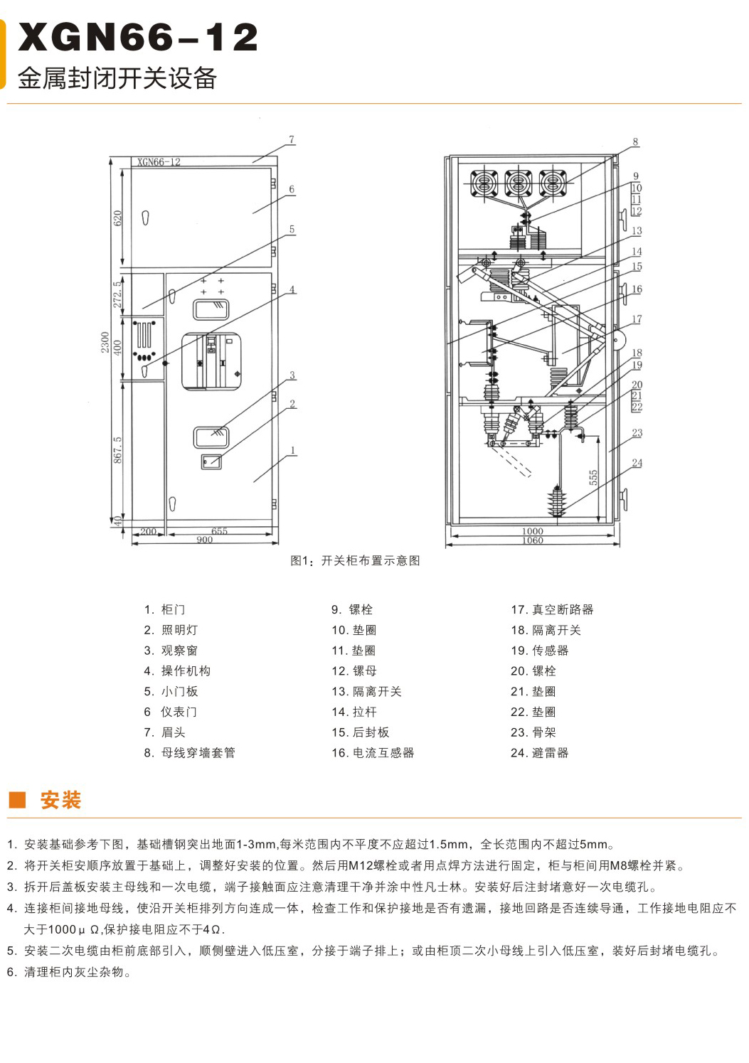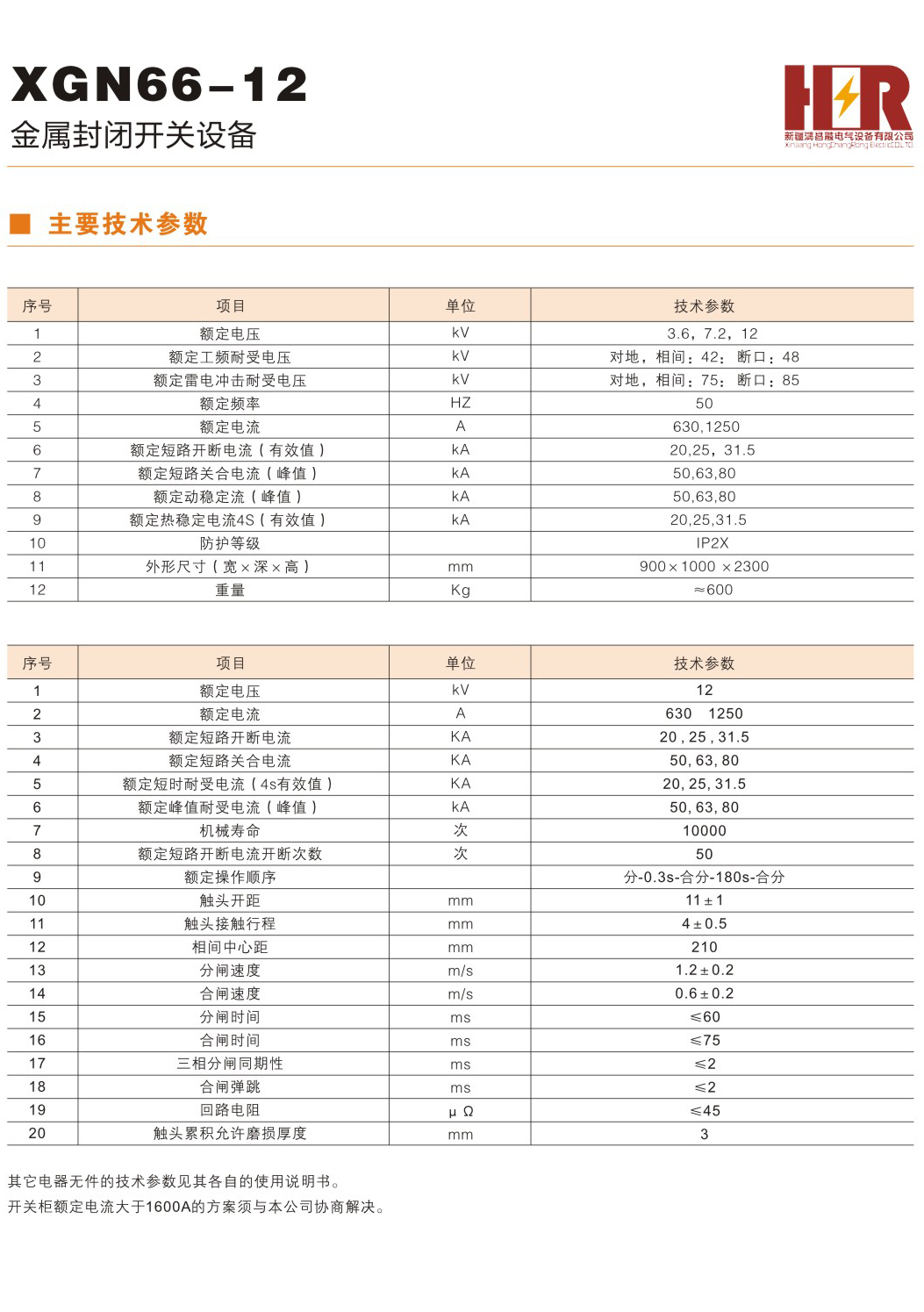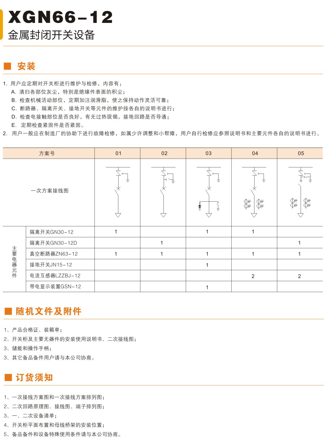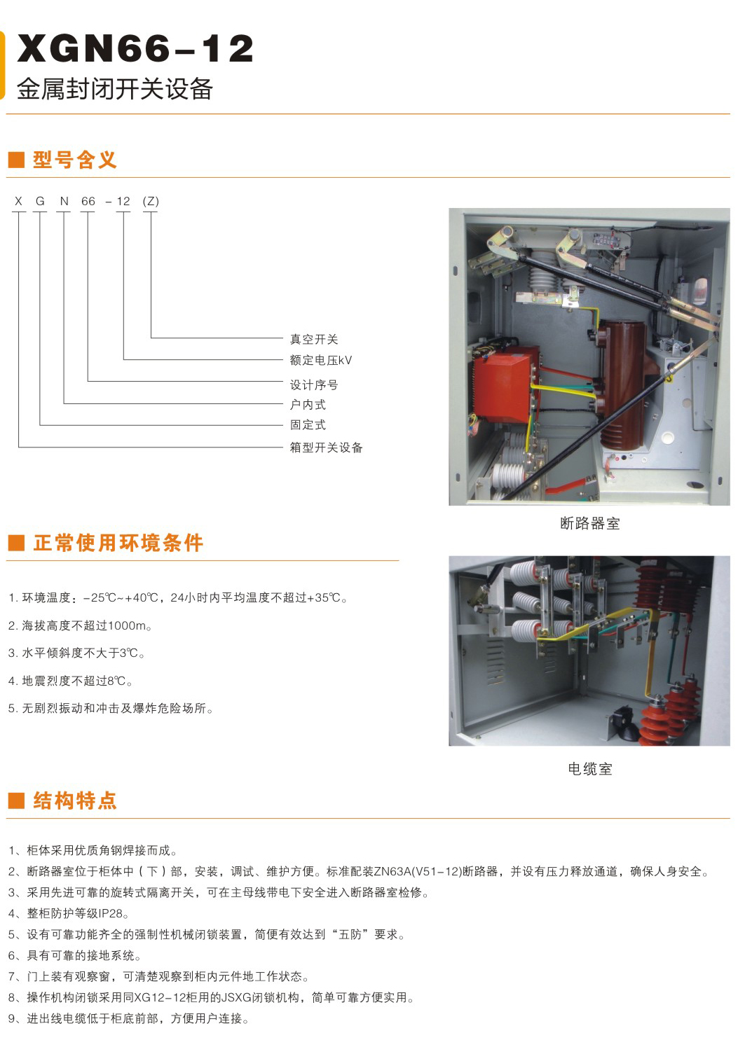 XGN66-12型固定式封闭开关设备(以下简称开关柜)是我公司新一代高压电器成套产品,符合国家标准GB3906《-35KV交流金属封 闭开关设备》电力部DLT404《户内交流高压开关柜订货技术条件》的要求,也满足国际标准IEC60298《1KV以上52KV以下交流金属封 闭开关设备和控制设备的要求》。 该产品吸收了国外先进技术,它体积小,仅是普通开关柜体保的50%;断路器具有可靠性高,性能好;“五防”联锁机构可靠、简 单等优点。开关柜是3.6、7.2、42KV三相交流电50HZ单母线分段的户内成套装置,作为接受和分配电能之用。并具有对电路进行控 制、保护和监测等功能,可使用在各类型发电厂、变电站及工矿企业,高层建筑等场所、也可与环网组合应用于开闭所中。