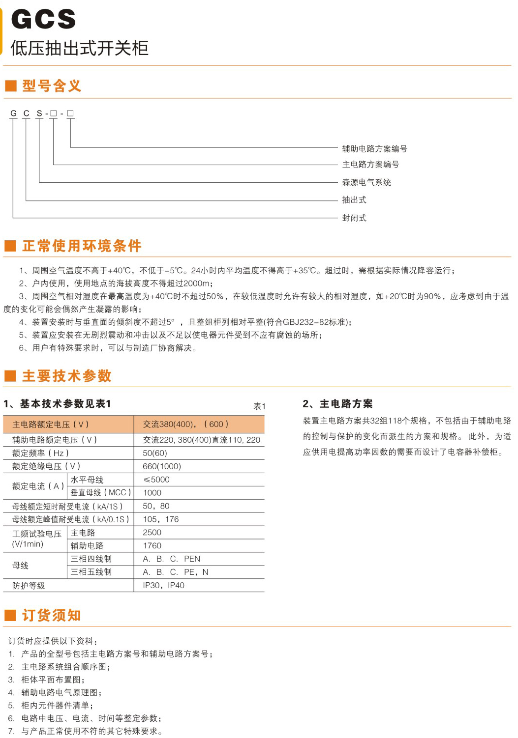 GCS型低压抽出式开关柜,(以下简称装置)是两部联合设计组根据行业主管部门、广大电力用户及设计单位的要求设计研制出的 符合国情,具有较高技术性能指标、能够适应电力市场发展需要并可与现有引进产品竞争的低压抽出式开关柜。该装置目前已被电力 用户广泛使用。 装置适用于发电厂、石油、化工、冶金、纺织、高层建筑等行业的配电系统。在大型发电厂、石化系统等自动化程度高,要求与 计算机接口的场所,作为三相交流频率为50(60)Hz、额定工作电压为380(400)V、(660)V,额定电流为5000A及以下的发、供电系统 中的配电、电动机集中控制、无功功率补偿使用的低压成套配电装置。装置的设计符合下列标准IEC439-1《低压成套开关和控制设备》GB7251《低压成套开关设备》