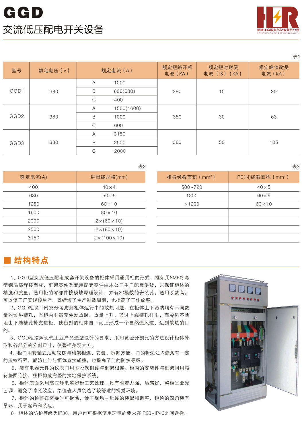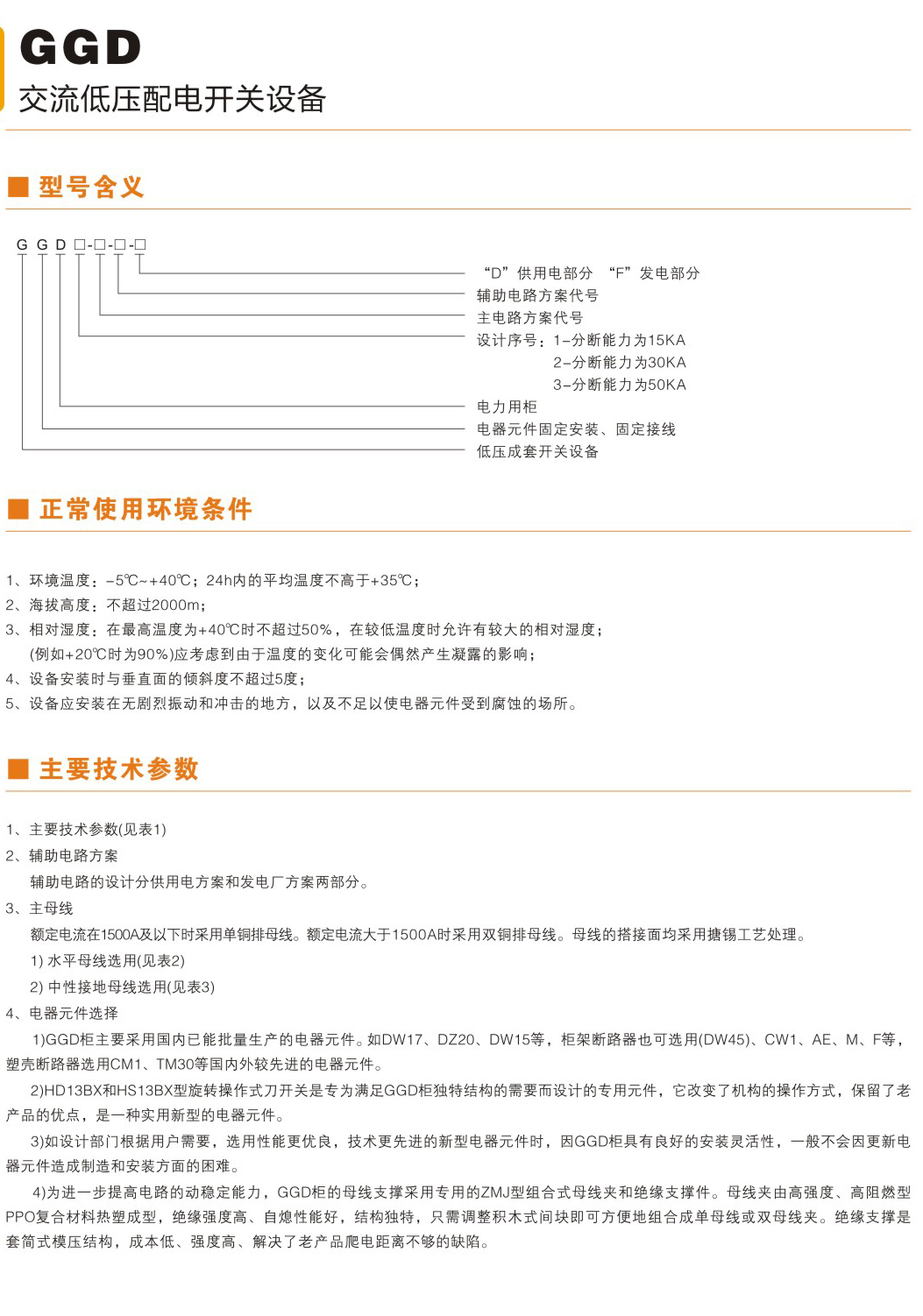 GGD型交流低压配电柜开关设备适用于发电厂、变电所,工矿企业等电力用户作为交流50H乙额定工作电压380V,额定电流至 3150A的配电系统中作为动力,照明及配电设备的电能转换、分配与控制之用。该产品分断能力高,额定短时耐受电流达50KA。线路 方案灵活、组合方便、实用性强、结构新颖等特点。该产品是我国组装式、固定面板开关柜的代表产品之一。该产品符合GB7251.1 《低压成套开关设备和控制设备》、IEC60439《低压成套开关设备和控制设备》等标准。