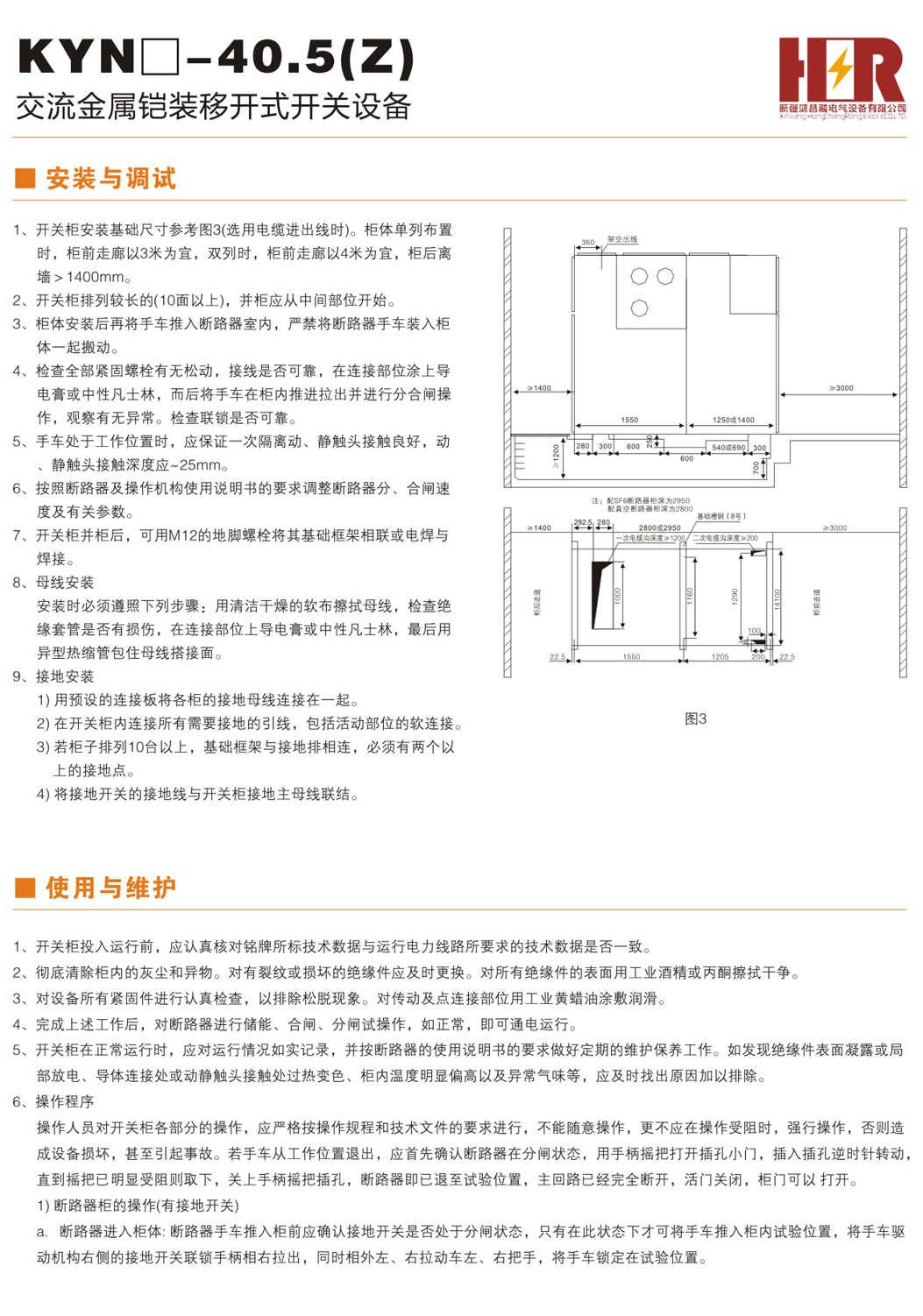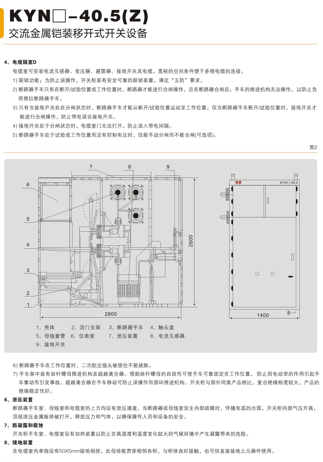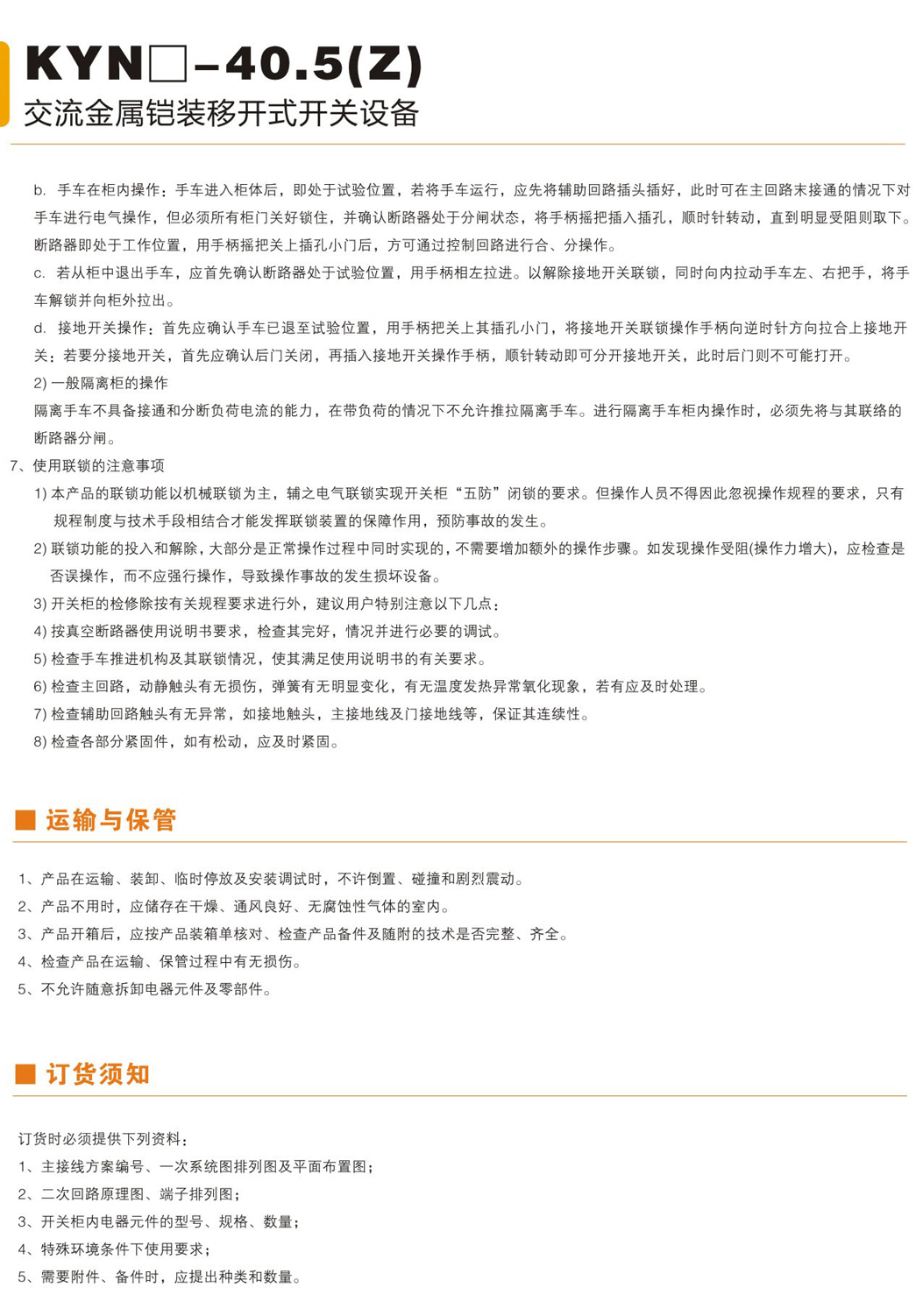 KYND-40.5(Z)交流金属铠装移开式开关设备(以下简称开关柜)系三相交流50Hz、额定电压40.5kV户内成套配电装置,主要用于 发电厂、变电站及工矿企业的配电室接受与分配电能,可实现对电路的控制、保护和检测之用;还可用于频繁操作的场所。本开关柜 符合GB3906-2006《3.6-40.5kV交流金属封闭开关设备和控制设备》、GB/T11022《高压开关设备和控制设备标准的共用技术要 求》、IEC62271:200《额定电压1kV以上52kV以下交流金属封闭开关设备和控制设备》、DL/T404《户内交流高压开关柜订货技术条 件》等标准。