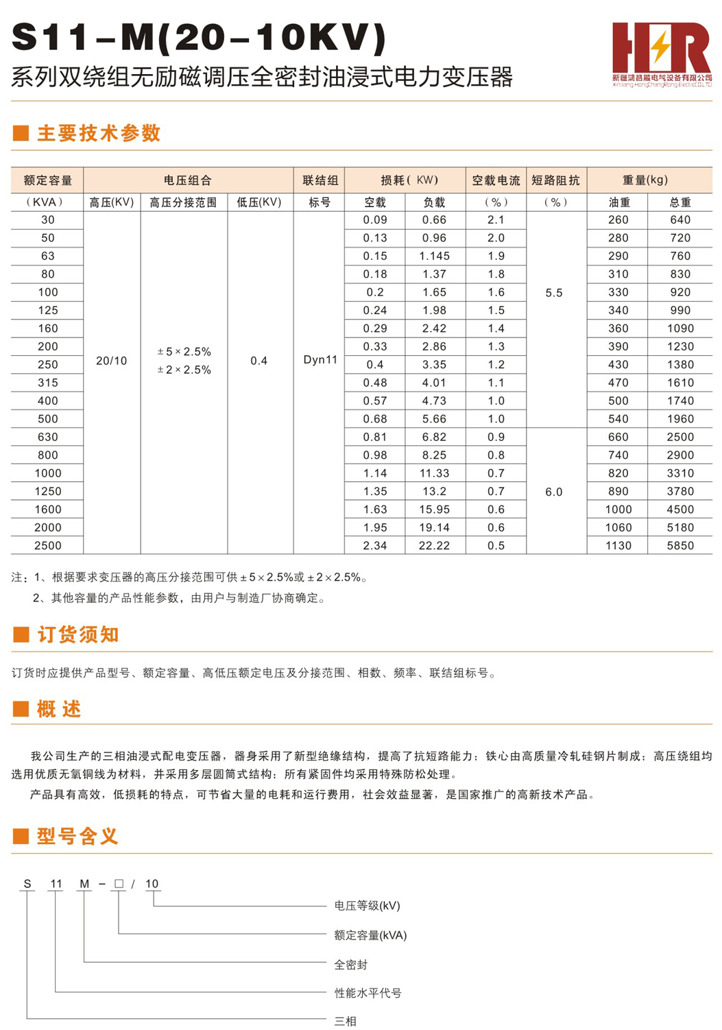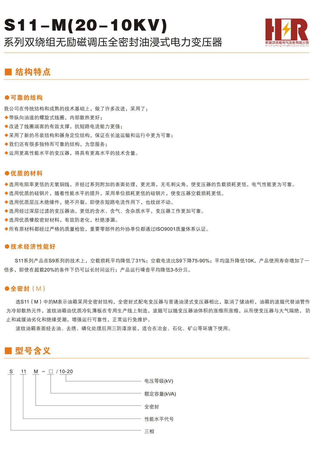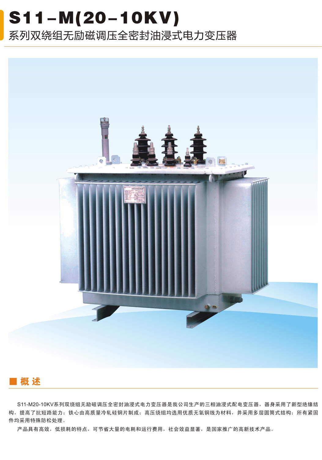 S11-M20-10KV系列双绕组无励磁调压全密封油浸式电力变压器是我公司生产的三相油浸式配电变压器,器身采用了新型绝缘结 构,提高了抗短路能力;铁心由高质量冷轧硅钢片制成;高压绕组均选用优质无氧铜线为材料,并采用多层圆筒式结构;所有紧固 件均采用特殊防松处理。 产品具有高效,低损耗的特点,可节省大量的电耗和运行费用,社会效益显著,是国家推广的高新技术产品。