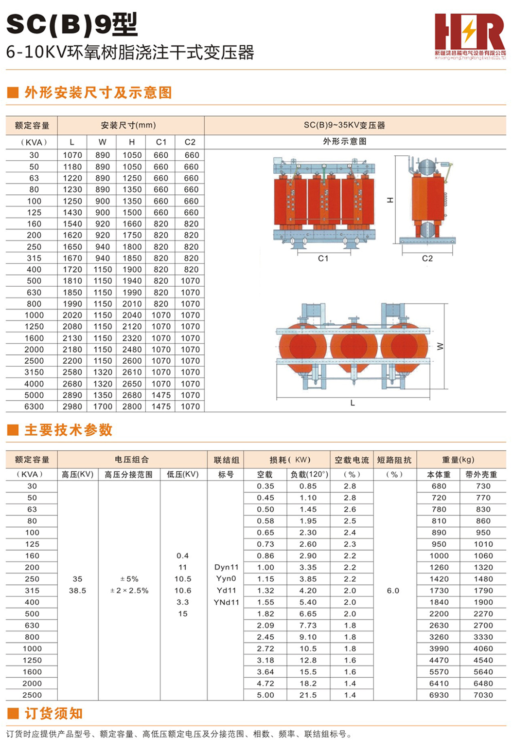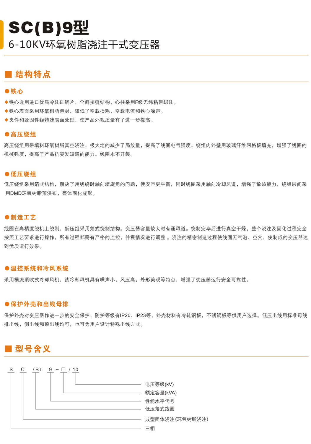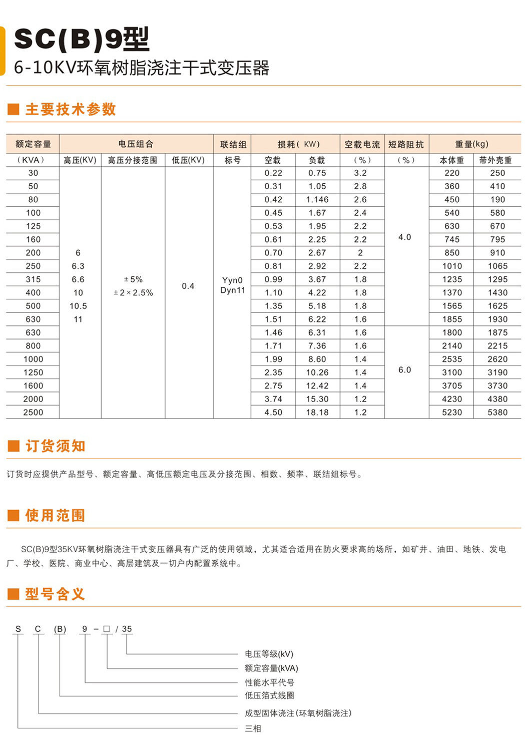 SC(B)9型6-10KV树脂绝缘干式变压器由于线圈被环氧树指包封,所以难燃,防火、防爆、免维护,无污染,体积小,可直接安装 在负荷中心。同时科学合理的设计和浇注工艺,使产品局部放电量更小,噪声低,散热能力强,在强迫风冷条件下可以在140%额定负 载下长期运行,并配有智能温控仪,具有故障报警,超温报警,超温跳闸以及黑闸子功能,并通过RS485串行接口与计算机相连,可 以集中监视和控制。 由于我公司干式变压器具有以上特点,因此广泛应用于输变电系统,如宾馆饭店,机场,高层建筑,商业中心,住宅小区等重要场 所,以及地铁,冶炼电厂,轮船,海洋钻井平台等环境恶劣场所。